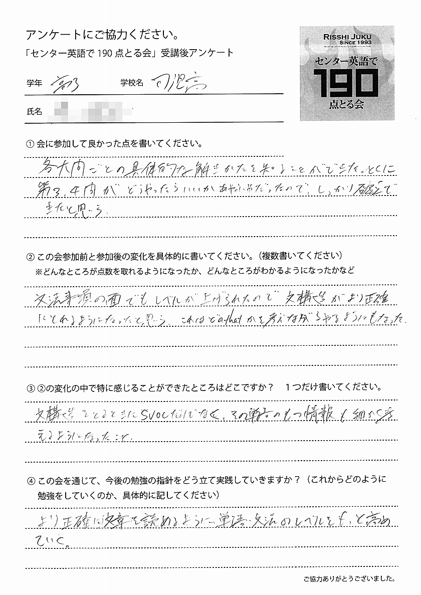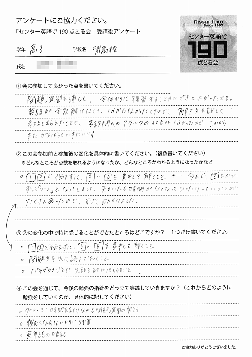 そして、昨年までの「センター英語で190点とる会」参加者の、